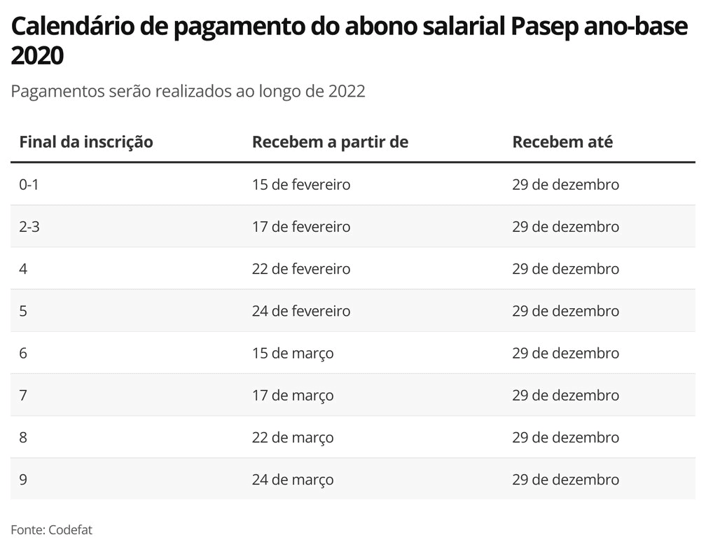 Nos últimos anos, o pagamento começava no segundo semestre de cada ano e terminava no primeiro semestre do ano seguinte, obedecendo ao mês de nascimento do trabalhador, no caso do PIS, ou o dígito final da inscrição do servidor público, no caso do Pasep. Agora, o pagamento começará no primeiro semestre do exercício fiscal seguinte. Ou seja, o calendário 2022, ano-base 2020, terá início em fevereiro de 2022.