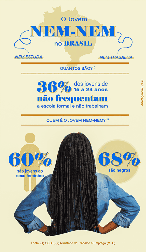 Entre os jovens desocupados, 52% são mulheres e 66% são pretos e pardos. Aqueles que nem trabalham nem estudam – os chamados nem-nem – somam 7,1 milhões, sendo que 60% são mulheres, a maioria com filhos pequenos, e 68% são pretos e pardos.