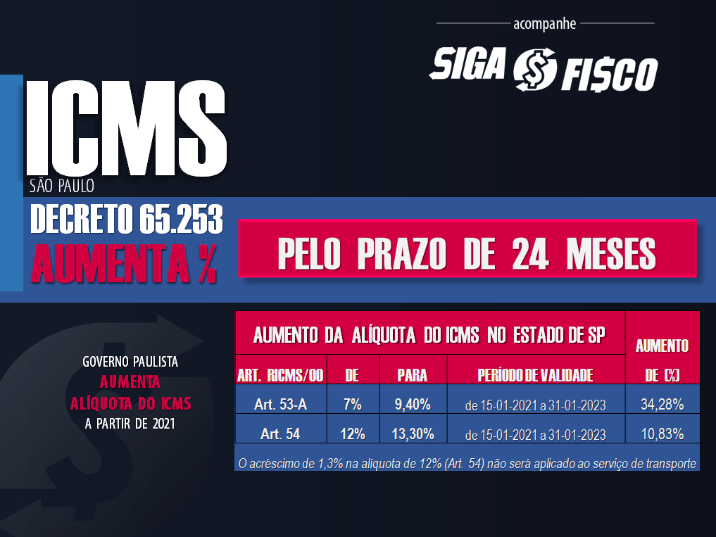 O aumento do imposto no Estado de São Paulo, foi autorizado pela Lei nº 17.293/2020, que aprovou o Pacote de Ajuste Fiscal.