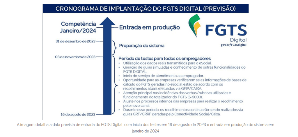 Está prevista para janeiro de 2024 a implementação do FGTS Digital. O cronograma prevê uma etapa de testes (produção limitada – ambiente simulado das funcionalidades), que será também um período para os empregadores já irem se adaptando à nova sistemática de recolhimento do FGTS. Todos os empregadores que são obrigados a recolher o FGTS devem ficar atentos às novas regras e buscar participar do período de testes. A previsão é que o período de testes se inicie 16/08/2023 e termine 03/11/2023.