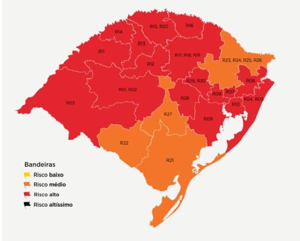 Apenas as regiões de Caxias do Sul e Guaíba estão em bandeira laranja, de risco médio. Outras 19 regiões ficam em bandeira vermelha.