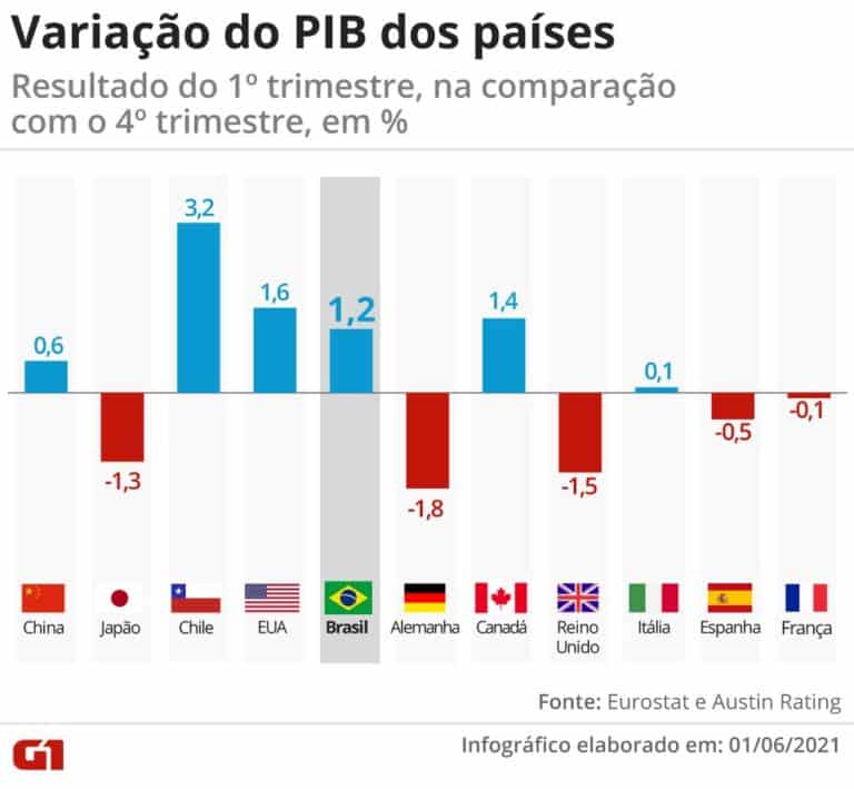 O desempenho do Produto Interno Bruno (PIB) brasileiro no 1º trimestre de 2021 ocupa o 19º lugar dentro de um ranking com 50 países, segundo levantamento elaborado pela Austing Rating. A lista traz os resultados das maiores economias do mundo.