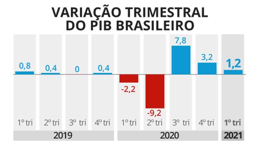 O Produto Interno Bruto (PIB) do Brasil cresceu 1,2% no 1º trimestre de 2021 na comparação com os três meses imediatamente anteriores. Frente ao mesmo trimestre de 2020, o crescimento foi de 1% – a primeira alta após uma sequência de quatro quedas.