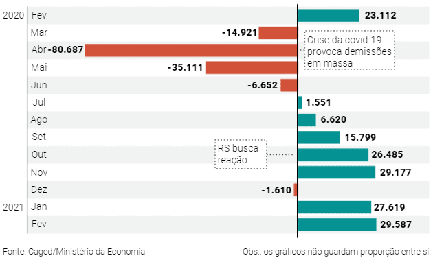Após amargar demissões em massa no começo da crise, o Estado voltou a ter saldo positivo de vagas (mais contratações do que cortes) em julho de 2020. Até fevereiro de 2021, houve sete meses de avanço na geração de postos de trabalho – a exceção foi dezembro.