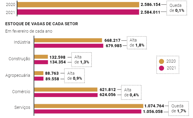 O setor de serviços, o maior da economia, pegou a contramão. É o único que ainda segue com nível de empregos abaixo do registrado antes da chegada da covid-19. Em fevereiro deste ano, o segmento tinha 1,056 milhão de vagas em estoque – 18,7 mil a menos do que em igual mês de 2020.