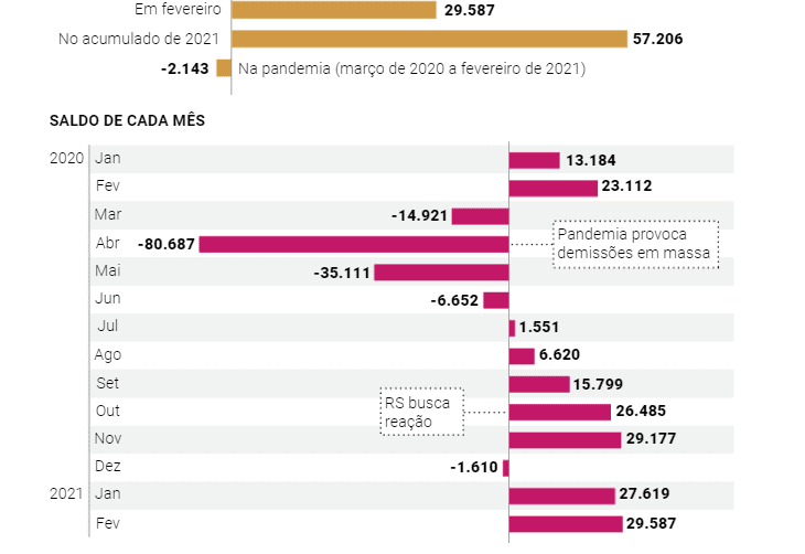 De março de 2020, quando achegada do coronavírus foi registrada, até fevereiro de 2021, o saldo seguiu negativo, com perda de 2.143 postos formais.