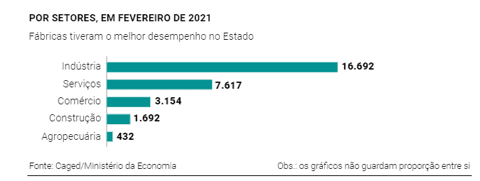 O maior saldo foi o da indústria: 16.692. Em seguida, vieram serviços (7.617) e comércio (3.154). Construção (1.692) e agropecuária (432) apareceram depois.